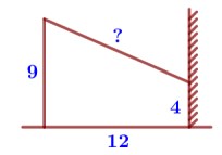 От столба высотой 9 м к дому натянут провод, который крепится на высоте 4 м от земли (см. рисунок). Расстояние от дома до столба 12 м. Найдите длину провода. Ответ дайте в метрах.