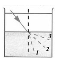 Луч света переходит из воды в воздух. Пунктирными линиями на рисунке намечены три направления: 1, 2 и 3. Какое из них может приблизительно соответствовать преломленному в этом случае лучу?