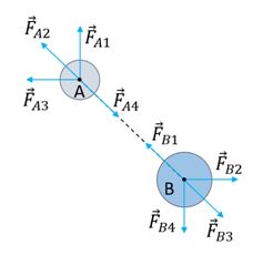 Два тела взаимодействуют друг с другом. На рисунке указаны силы, действующие на тело A, и указаны силы, действующие на тело B. Определите, какие из сил могли возникнуть из-за взаимодействия двух этих тел.