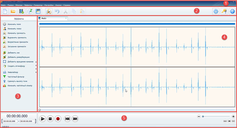 Укажите номер области в программе «Аудиомастер», с помощью которой можно вырезать, скопировать, вставить фрагмент, открыть имеющийся или создать новый файл однократным нажатием левой кнопки мыши.