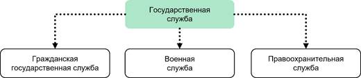 Принято выделять следующие виды государственной службы: гражданская государственная служба, военная служба и правоохранительная служба.