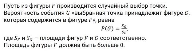Вероятность события «выбранная точка принадлежит фигуре G» прямо пропорциональна площади фигуры G и не зависит от расположения и формы фигуры G.