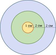 Пример. Стрелок стреляет издалека по круглой мишени радиусом 5 см. Мишень разбита на три зоны. Радиус центральной круговой зоны равен 1 см. Средняя и внешняя зоны – кольцевые. Ширина каждой из них равна 2 см.