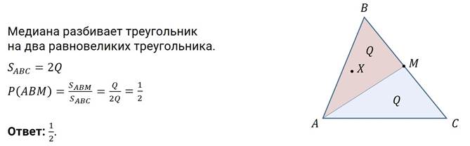 Задание первое. Внутри треугольника АВС случайным образом выбирается точка Х. Найдите вероятность того, что эта точка попала в треугольник АВМ, где АМ – медиана треугольника АВС.