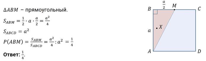 Задание второе. В квадрате АВСD случайным образом выбирается точка X. Найдите вероятность того, что эта точка принадлежит треугольнику АВM, где точка М – середина стороны ВС.