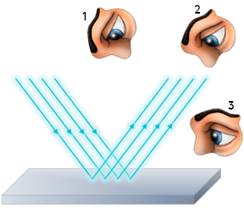 Если же глаз расположен иначе, отражённые лучи не попадут в него и изображение мы не увидим. Такой тип отражения света от гладких поверхностей называется зеркальным отражением. Примером такой поверхности является спокойная водная гладь.
