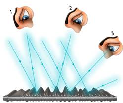Это явление известно как диффузное или рассеянное отражение. В случае такого типа отражения поверхность остаётся видимой независимо от положения наблюдателя, поскольку световые лучи распространяются во всех направлениях.
