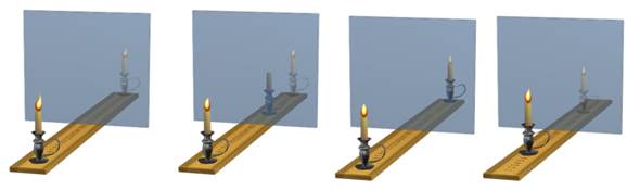 Продолжим наш эксперимент. Переместим свечу ближе к стеклянной пластине. Её изображение также приблизится. Причём стоит отметить, что оно сблизится ровно настолько, насколько сдвинулась сама свеча. Положение изображения останется неизменным, если заменить стеклянную пластину на плоское зеркало.