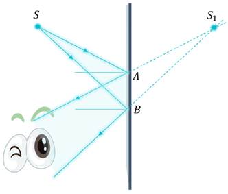 Если продлить отражённые лучи за плоскость зеркала, они пересекутся в точке S1. Глаз воспринимает отражённые лучи таким образом, словно они исходят из этой точки, которая представляет собой изображение светящейся точки S. Другими словами, глазу кажется, что светящаяся точка находится именно здесь, хотя на самом деле реального источника света в этом месте нет. Такое изображение называют мнимым. Следовательно, плоское зеркало всегда создаёт мнимое изображение.