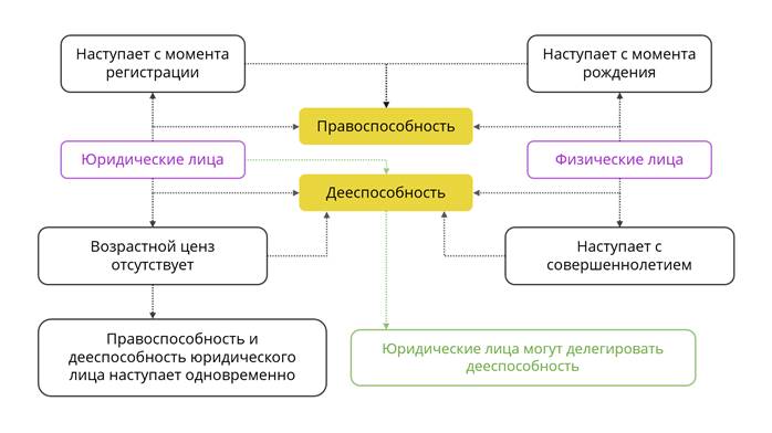 Что же касается дееспособности, то у физических лиц дееспособность наступает с совершеннолетием либо в исключительных случаях раньше. У юридических лиц такой возрастной ценз отсутствует. Правоспособность и дееспособность юридического лица наступает одновременно.