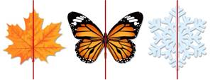 Ребята, посмотрите на кленовый лист, бабочку, снежинку. Давайте на каждом из рисунков начертим прямую линию вот таким образом, то есть посередине.