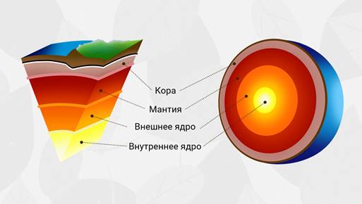 В настоящее время наука уверена, что ядро нашей планеты состоит из двух отдельных слоёв: внутреннее ядро из твёрдого никеля и железа и внешнего ядра из расплавленного никеля, и железа. При этом мантия представляет собой очень плотную и почти полностью твёрдую силикатную породу. Кора также состоит из силикатных пород и разнится по своей толщине.