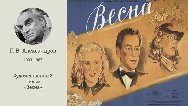 В 1947 году вышел фильма «Весна», режиссёра Григория Александрова. В нем сыграли такие актёры, как Фаина Раневская, Любовь Орлова, Ростислав Плятт, Рина Зелёная.
