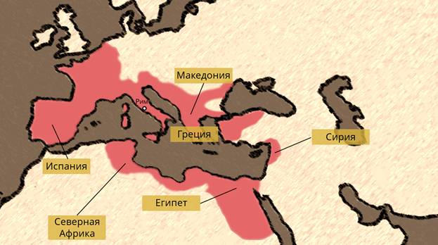В середине 1 века до нашей эры под властью Рима оказалась Сирия. В 30 году до нашей эры римляне завоевали Египет – последнее эллинистическое государство Средиземноморья.
