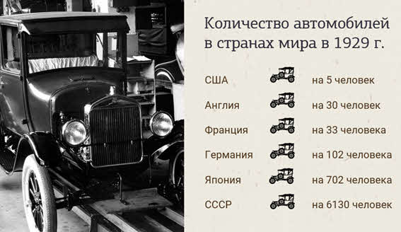 Вот данные за 1929 год. В США на один автомобиль приходилось 5 человек. В Англии – 30. Во Франции – 33. В Германии – 102. В Японии – 702. И 6130 человек – в СССР. Этот факт, кстати, помогает понять, насколько важным и насущным для Советского Союза было осуществление индустриализации.