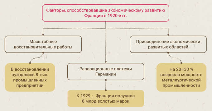 Не забываем о территориальном приращении Франции. Благодаря возвращению в её состав Эльзаса и Лотарингии на 20–30 % возросла мощность металлургической промышленности. Решение финансовых проблем облегчали германские репарации. За это время французская казна пополнилась 8 миллиардами золотых марок.