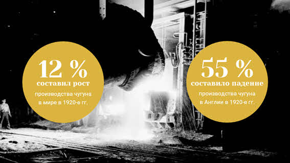 А вот в старых отраслях наблюдался даже не застой, а спад. Речь идёт об угледобывающей, текстильной, металлургической промышленности. Например, в то время как во всём мире производство чугуна увеличилось на 12 %, в Англии оно сократилось на 55 %.
