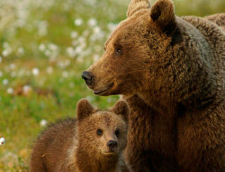 Он относится к семейству медвежьих и является одним из самых крупных хищников на Земле. Бурый медведь имеет массивное тело, покрытое густым и плотным мехом, который может быть различных оттенков – от светло-коричневого до тёмно-коричневого или даже чёрного. Они имеют длинные и сильные лапы с острыми когтями, которые помогают им копаться в поисках пищи или защищаться от угроз. Хозяин тайги обладает превосходным обонянием и слухом, что помогает ему находить пищу и избегать опасности. Они питаются разнообразными продуктами – от растительной пищи, такой как ягоды, коренья и трава, до мяса, включая мелких млекопитающих и даже крупных животных, например, оленя, ещё эти косолапые мишки любят рыбу. За раз медведь может съесть около 70 килограмм еды. Бурый медведь обладает выдающимися навыками во время охоты и обладает отличной выносливостью. Они могут плавать, карабкаться по деревьям и бегать со скоростью до 50 км/ч. Продолжительность жизни бурого медведя составляет 20–30 лет, вне дикой природы, в зоосаде, например, они могут прожить и до пятидесяти лет. Нюх у медведя в сто раз лучше, чем у человека, он может учуять пчелиный улей на расстоянии восьми километров.