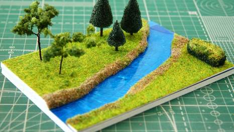 Трава газонов делается из ворсистого материала, выкрашенного в зелень, водоёмы – из голубой плёнки или окрашенной бумаги.