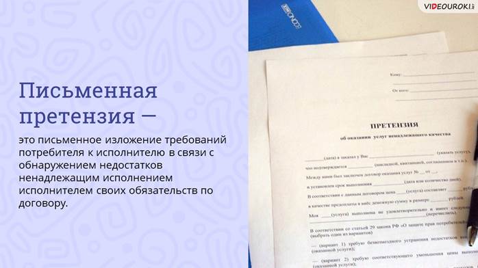 Если исполнитель не идёт навстречу, можно оставить составьте «письменную претензию» – это письменное изложение требований потребителя к исполнителю в связи с обнаружением недостатков ненадлежащим исполнением исполнителем своих обязательств по договору.