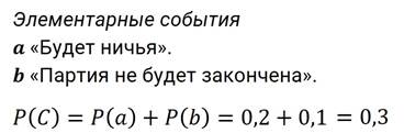 Пример. В шахматной партии Саша играет с Лёшей. Вероятность выигрыша Саши равна 0,4, вероятность ничьей равна 0,2, вероятность того, что партия не будет закончена, равна 0,1. Давайте найдём вероятность того, что Саша не проиграет.