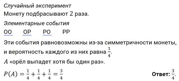 Задание третье. Симметричную монету бросают 2 раза. Найдите вероятность того, что орёл выпадет хотя бы 1 раз.