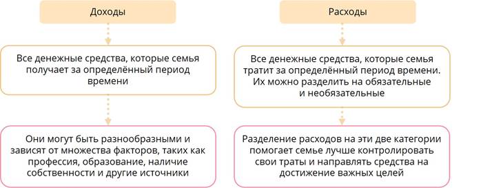 Доходы — это все денежные средства, которые семья получает за определённый период времени. Они могут быть разнообразными и зависят от множества факторов, таких как профессия, образование, наличие собственности и другие источники.