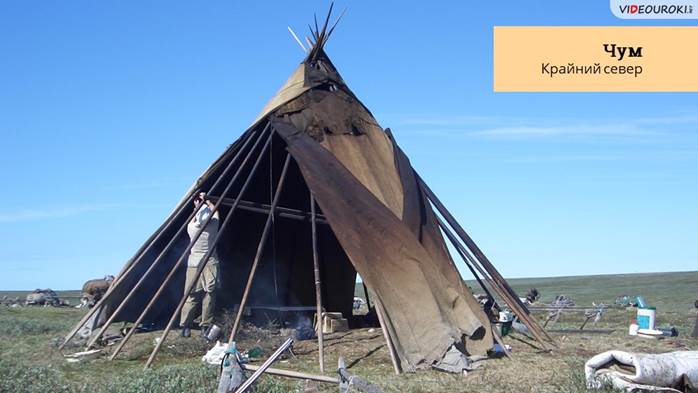 Перемещаясь на крайний север страны, мы встречаем традиционные чумы, которые используются такими народами, как коми, ненцы и ханты. Чум представляет собой своеобразный шалаш конической формы, основу которого из дерева укрывают корой, оленьей шкурой или войлоком. Этот материал сохраняет тепло, а сам чум легко собирать и разбирать, что позволяет его владельцам вести кочевой образ жизни. Такое жилище хорошо защищает от холодного ветра и создаёт уютное пространство внутри.