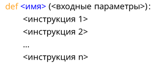 Функцией называется подпрограмма, которая позволяет производить одни и те же действия над различными данными в различных местах программы. Рассмотрим, каким образом функция описывается в языке Python. Описание функции начинается со служебного слова def, что в переводе на русский язык означает «определение», после которого через пробел следует имя функции. Далее следует пробел, и в скобках, через запятую, указываются входные параметры функции. Следом идёт двоеточие, а после него, со следующей строки с отступом, следуют инструкции, составляющие тело функции. Функция описывается в программе до её первого использования.