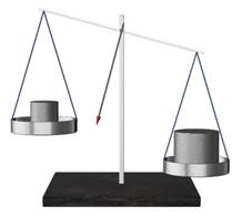 Теперь давайте вместо тележек воспользуемся рычажными весами. Поместим наши цилиндры на чаши весов. Легко увидеть, что при одинаковом объёме масса одного цилиндра превышает массу другого. Это подсказывает нам, что цилиндры изготовлены из разных веществ. Отсюда следует важный вывод: масса тела зависит от вещества, из которого оно состоит.