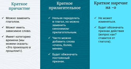 Ещё важнее бывает отличить краткое причастие от краткого прилагательного и краткого наречия на -о. Потому что в кратком причастии будет писаться одна буква Н. В кратком прилагательном – столько же, сколько и в полном. Но обычно это НН, потому что краткие прилагательные, похожие на страдательные причастия, часто от этих же причастий и образованы. И в наречии на -о будет писаться столько же букв Н, сколько в прилагательном, от которого оно произошло. То есть тоже Н Н.