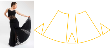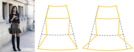Форму клина можно и усложнить. Например, для более плотного облегания юбки по бедрам допускается небольшое уменьшение клина ниже линии бедер, при этом ширина по линии низа остается прежней или может быть увеличена. Такая юбка называется годе.