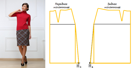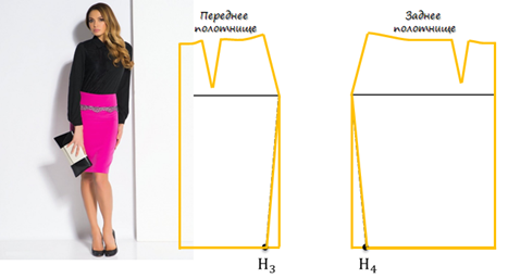 Для того чтобы расширить юбку по линии низа нужно на чертежах переднего и заднего полотнищ со стороны линии бокового среза отложить по линии низа желаемое расширение. Затем соединить полученные точки Н3 и Н4 с линиями бокового среза. Для этого нужно провести касательные прямые к линиям боковой вытачки. После этого обвести контур чертежа по намеченным линиям.