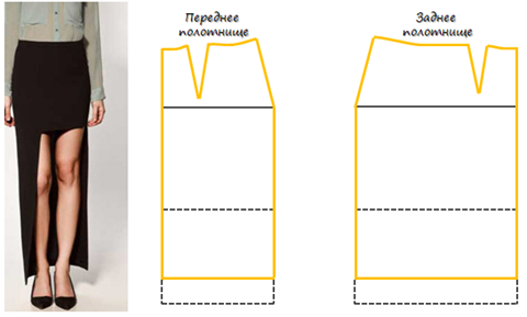 Для этого на готовый чертеж двухшовной конической юбки нужно нанести линии разреза так, чтобы они совпали на боковых швах переднего и заднего полотнищ.