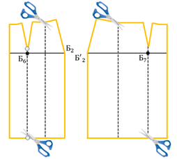 Для этого по осевым линиям вытачек переднего и заднего полотнищ, а также через середины отрезков Б6Б2 и Б’2Б7 нужно провести вертикальные прямые линии до их пересечения с линией низа. Затем разрезать выкройки по намеченным линиям. И раздвинуть полученные части на нужную ширину. После этого оформить линию низа плавной кривой.