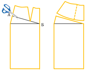 Для того чтобы сделать в юбке кокетку нужно через конец вытачки переднего (или заднего) полотнища провести прямую линию АБ. Разрезать выкройку по этой линии и из отрезанных верхних частей сложить кокетку. При этом закрыть вытачку. Верхний и нижний срезы кокетки оформить плавной линией.