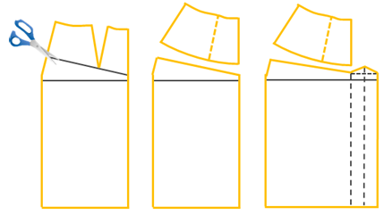 Провести на переднем полотнище линию кокетки через конец вытачки. Отрезать кокетку. Закрыть вытачку. Оформить верхний и нижний срезы кокетки плавными линиями.