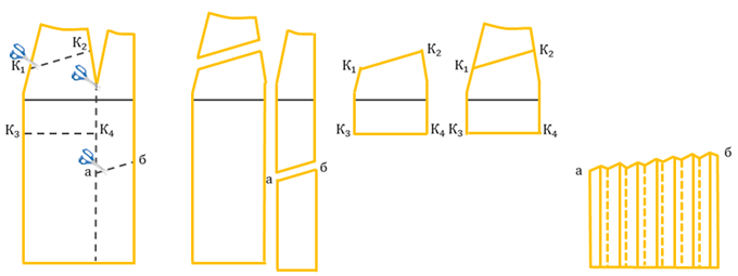 Давайте рассмотрим последовательность расширения прямой юбки методом закрытия вытачек.