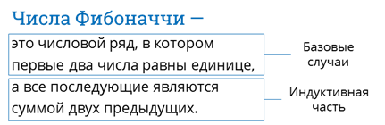 Рекурсией называется способ определения множества объектов через это же множество на основе заданных базовых случаев. Многим из вас это определение может показаться сложным, у других может возникнуть вопрос: «Как же множество объектов может определять само себя?». Рассмотрим пример из математики. Числами Фибоначчи называется числовой ряд, в котором первые два числа равны единице, а все последующие являются суммой двух предыдущих. Обратим внимание на то, что это определение состоит из двух частей. Вторая часть определения называется индуктивной, в ней число Фибоначчи определяется через два предыдущих числа, а первая часть определения указывает на те самые базовые случаи, то есть на то, что первые два числа Фибоначчи равны единице.