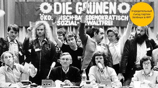 В то же время в ФРГ появилась партия зелёных. Им удалось объединить представителей разных общественных движений, за счёт этого они получили места в парламенте.
