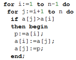 Запишем данный алгоритм в виде программы. Назовём её «Сорт». В разделе описания переменных будут записаны массив из ста элементов типа integer, а также переменные n, i, j и p. Запишем тело программы. Считаем длину последовательности чисел и запишем цикл for i:=1 to n do, в котором будем генерировать случайные числа для последовательности и сразу же, через пробел, выводить их на экран. Так как элементы мы выводили через пробел, то после цикла должна быть команда перехода на следующую строку, то есть команда writeln без параметров. Теперь приступим непосредственно к сортировке массива. Запишем цикл for i:=1 to n-1 do, а внутри него ещё один цикл for j:=i+1 to n do. Внутри двух этих циклов будет условный оператор, который будет проверять a[j] < a[i], и в случае, если условие будет выполнятся, запишем последовательность команд для того, чтобы поменять местами i-тый и j-тый элементы массива через переменную p. Запишем цикл для вывода элементов массива на экран в одну строку, через пробел.