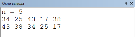 Запустим программу на выполнение и зададим длину последовательности чисел, равную 5. Мы получим последовательности до сортировки и после. Обратим внимание, что в нижней строке элементы действительно отсортированы по невозрастанию.