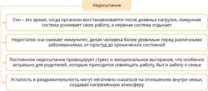 Для взрослых недосыпание также имеет серьёзные последствия. Сон — это время, когда организм восстанавливается после дневных нагрузок, иммунная система усиливает свою работу, а нервная система отдыхает. Недостаток сна снижает иммунитет, делая человека более уязвимым перед различными заболеваниями, от простуд до хронических состояний. Кроме того, постоянное недосыпание провоцирует стресс и эмоциональное выгорание, что особенно актуально для родителей, которым приходится совмещать работу, быт и заботу о семье. Усталость и раздражительность могут негативно сказаться на отношениях внутри семьи, создавая напряжённую атмосферу.