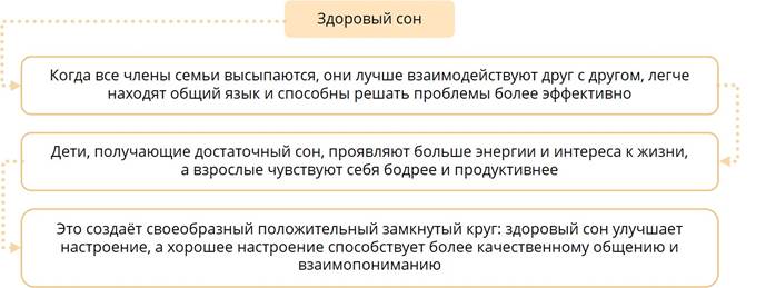 С другой стороны, семья, где каждый член получает необходимое количество качественного сна, становится более сплочённой и жизнерадостной. Когда все члены семьи высыпаются, они лучше взаимодействуют друг с другом, легче находят общий язык и способны решать проблемы более эффективно. Дети, получающие достаточный сон, проявляют больше энергии и интереса к жизни, а взрослые чувствуют себя бодрее и продуктивнее. Это создаёт своеобразный положительный замкнутый круг: здоровый сон улучшает настроение, а хорошее настроение способствует более качественному общению и взаимопониманию.
