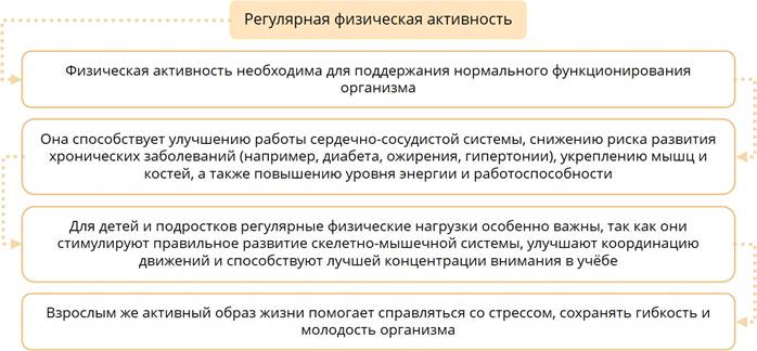 Физическая активность необходима для поддержания нормального функционирования организма. Она способствует улучшению работы сердечно-сосудистой системы, снижению риска развития хронических заболеваний (например, диабета, ожирения, гипертонии), укреплению мышц и костей, а также повышению уровня энергии и работоспособности. Для детей и подростков регулярные физические нагрузки особенно важны, так как они стимулируют правильное развитие скелетно-мышечной системы, улучшают координацию движений и способствуют лучшей концентрации внимания в учёбе. Взрослым же активный образ жизни помогает справляться со стрессом, сохранять гибкость и молодость организма.