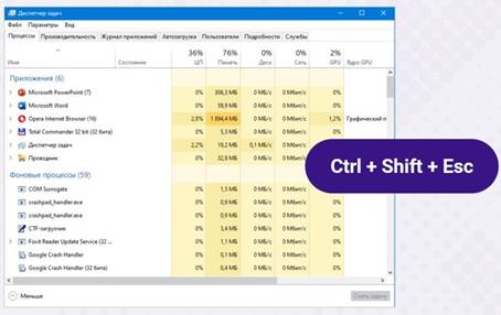 · Запускаем диспетчер задач, нажав комбинацию Ctrl + Shift + Esc.