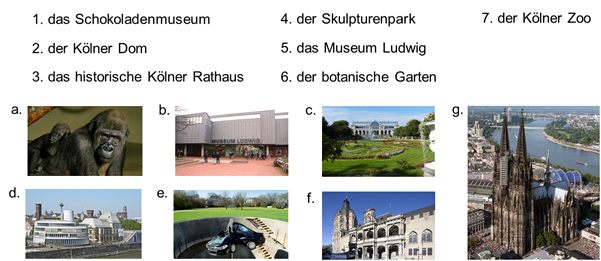 In Köln gibt es auch eine große Universität, viele Schulen, viele Museen, eine Oper, Synagogen, viele Geschäfte, Seen und schöne Parks.