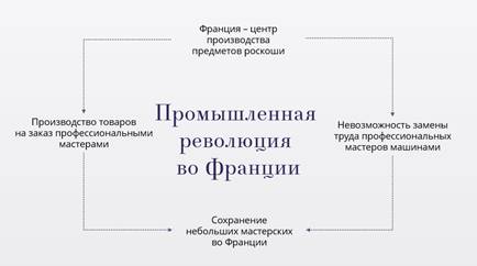 В некоторой степени это объясняется тем, что Франции издавна была центром производства предметов роскоши (дорогих тканей, ювелирных изделий, парфюмерии, мебели). Эти товары делались на заказ профессиональными мастерами. Машины не могли заменить их труд.