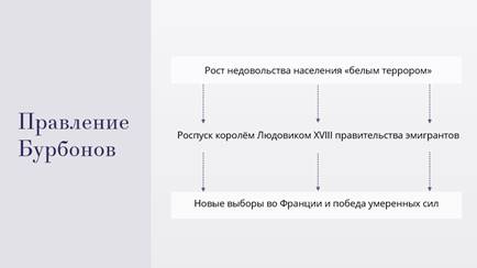 Эти люди заняли важные места в правительстве и развязали «белый террор». «Белый террор» – это меры правительства (аресты, казни, ссылки, увольнения), направленные против сторонников Наполеона I, способствовавших его возвращению к власти в ходе «Ста дней».