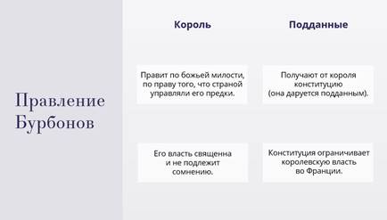 Эти слова выражали главную задачу монархии Бурбонов – найти компромисс между старыми порядками и порядками, сложившимися за время революции и Первой империи. Создать новую Францию.
